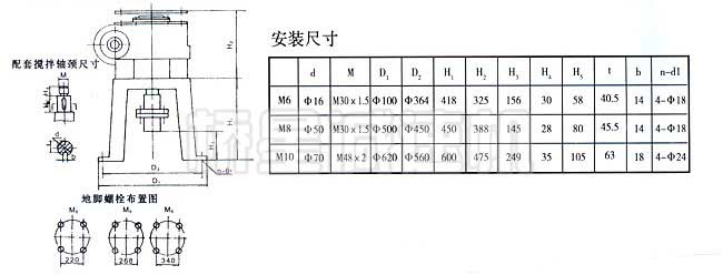 M型減速機及支架 本機適用于無大震動情況下的立式化工容器。如制藥、油漆、牙膏、造酒、造紙、食品加工釜等反應的攪拌軸傳動裝置。攪拌軸方向不可逆時順,由上往下看攪拌軸方向應以順時針為適宜但也可作為永久性逆轉。工作環境溫度應在-5度至20度內為宜。 結構與安裝尺寸